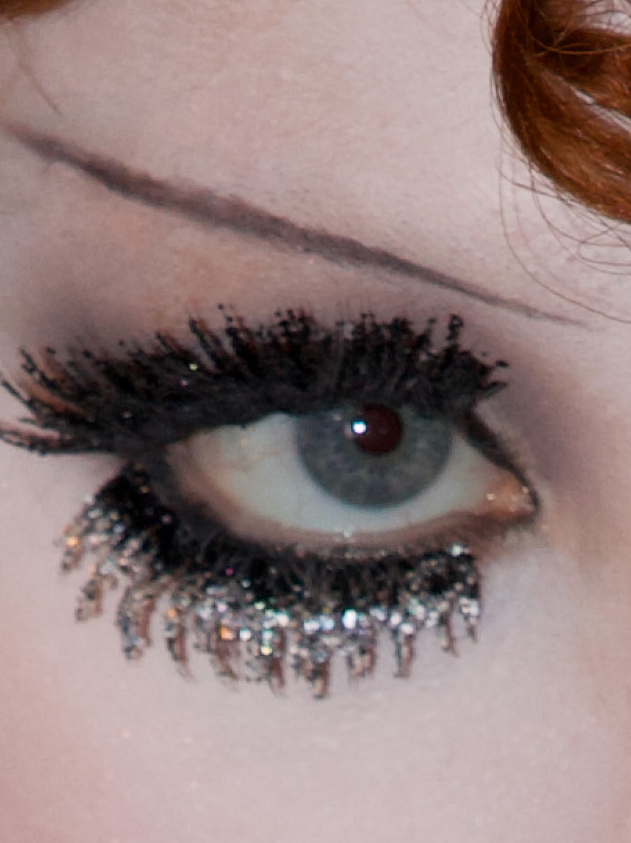 9. Nadaj rzęsom niesamowitą objętość i długość tuszem M·A·CStack Mascara. Następnie nałóż M·A·C Lash / 76 Supermodel Lash oraz M·A·C Lash / 80 Romantic Lash na górne i dolne linie rzęs i użyj Dazzleshadow Liquid Eye Shadow, aby przykleić brokat na końcówki rzęs.